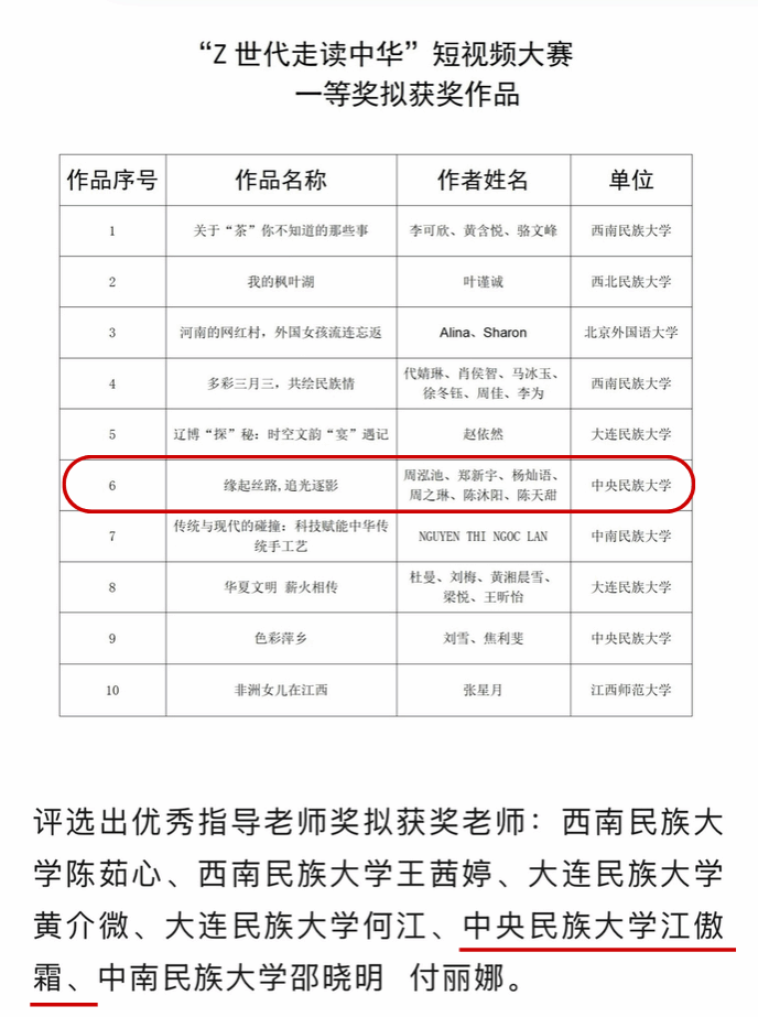 本科生杨灿语、周泓池和研究生郑新宇团队的作品《缘起丝路,追光逐影》荣获大赛一等奖。同时,江傲霜老师获评“优秀指导老师”荣誉称号。