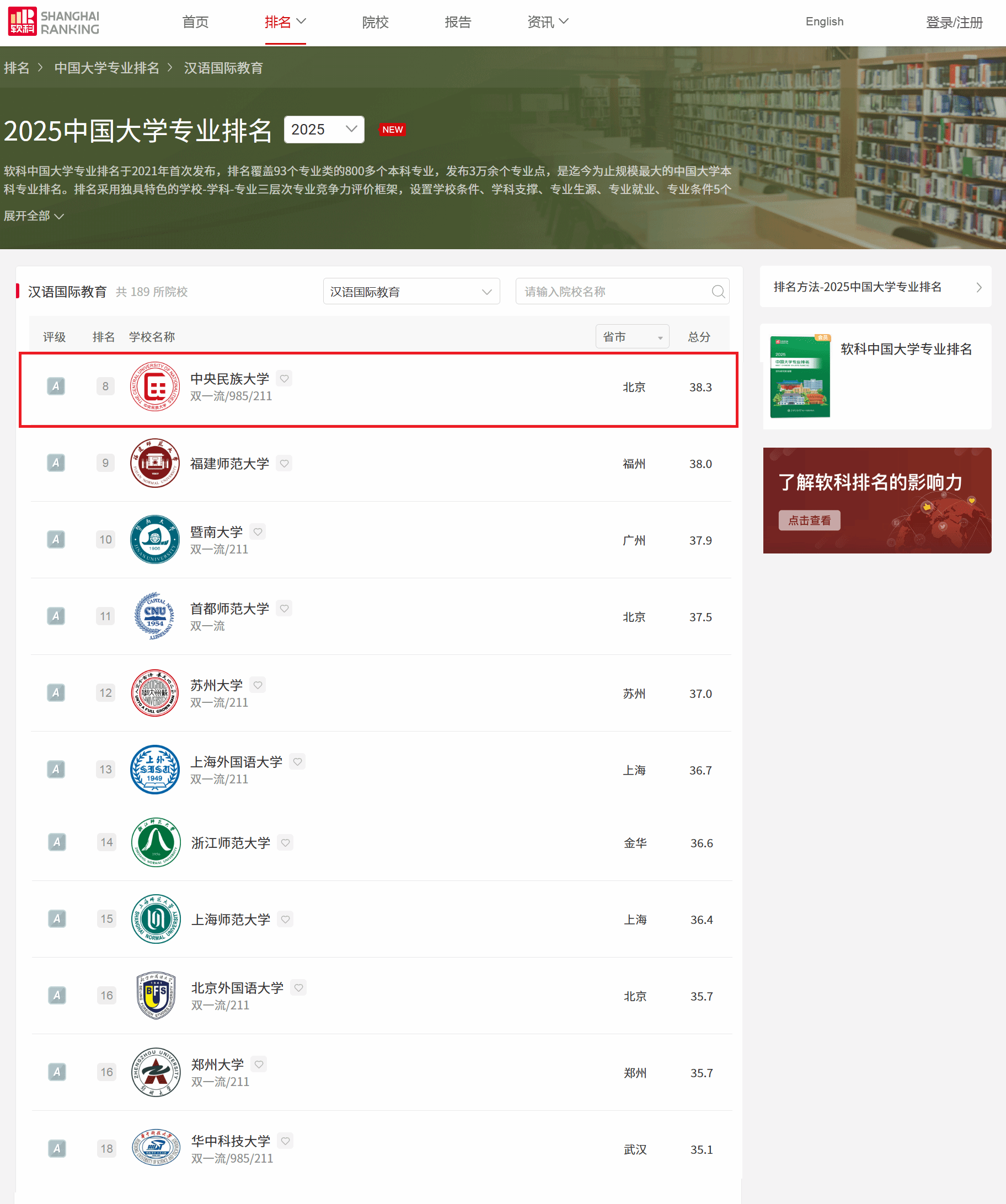 汉语国际教育专业以全国第8名的成绩位列A档,较2024年上升3位,彰显了91暗网