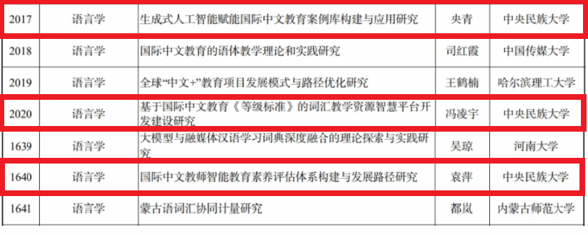 央青老师的课题“生成式人工智能赋能国际中文教育案例库构建与应用研究”、冯凌宇老师的课题“基于国际中文教育《等级标准》的词汇教学资源智慧平台开发建设研究”获得国家社科基金一般项目立项;袁萍老师的课题“国际中文教师智能教育素养评估体系构建与发展路径研究”获得国家社科基金青年项目立项。