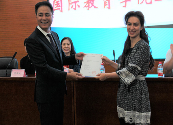 稍后,李锷副院长宣读了来自国家留学基金管理委员会的喜讯,恭喜何枫同学获得中国政府优秀生来华留学生奖学金,周铁海书记为其颁发奖状,鼓励新生以何枫为榜样,超越自我,追求卓越。