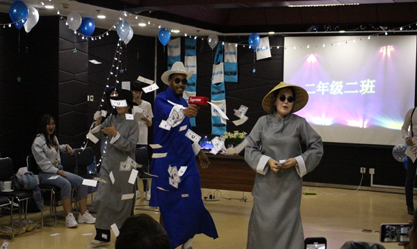本科二年级二班的节目叫《民大有嘻哈》,整个表演以故事的形式来呈现。优美的华尔兹舞,搞笑的RAP,极度创意的编排,得到了全场师生的大加赞赏。