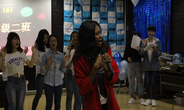 本科一年级二班的学生为大家合唱了一首耳熟能详的歌曲《童话》,这首歌曲在国际学生中传唱度颇高,一度引起了全场的大合唱,同学们一边唱着这首温暖人心的歌曲,一边挥舞着手臂,全场顿时弥漫着一片祥和之气。