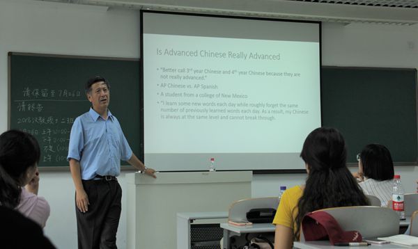 7月27日,冯禹教授为大家介绍了为准高级汉语水平的学生编写教辅材料的准则(Guidelines for Textbooks on Pre-advanced Level)。如每篇课文要包含三种元素:一个明确的中心语法、一个可讨论的话题、一份设计恰当的作业,教辅内容要涵盖多种话题并运用多种语体等。