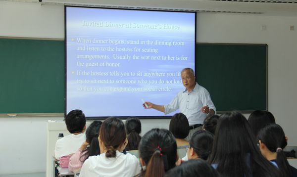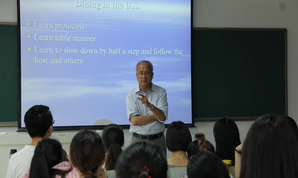 8月6日,王觉非教授从“在美衣着礼仪、餐桌礼仪”等方面展开讲解,用自己的亲身经历为大家讲述了正确规范的做法,并指出错误做法的失礼之处。其中贯穿的一些具体事例使大家更直观地了解相关情况,给大家留下了深刻的印象。课堂最后,王觉非教授还向同学们介绍了“英语学术著作速读法”,为今后同学们做学术科研提供了很大的帮助。