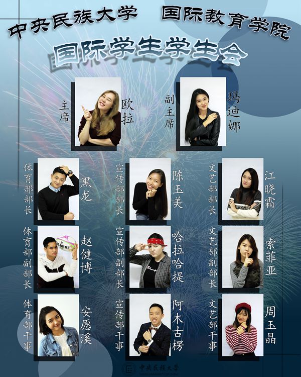 国际学生学生会由11名国际学生组成,分别是主席欧拉、副主席玛迪娜、体育部部长黑龙、宣传部部长陈玉美、文艺部部长江晓霜、体育部副部长赵健博、宣传部副部长哈拉哈提、文艺部副部长索菲亚、体育部干事安愿溪、宣传部干事阿木古楞、文艺部干事周玉晶。成员们一一登台介绍了自己和在学生会中的职责,并鼓励其他同学也加入到学生会这个大家庭中。