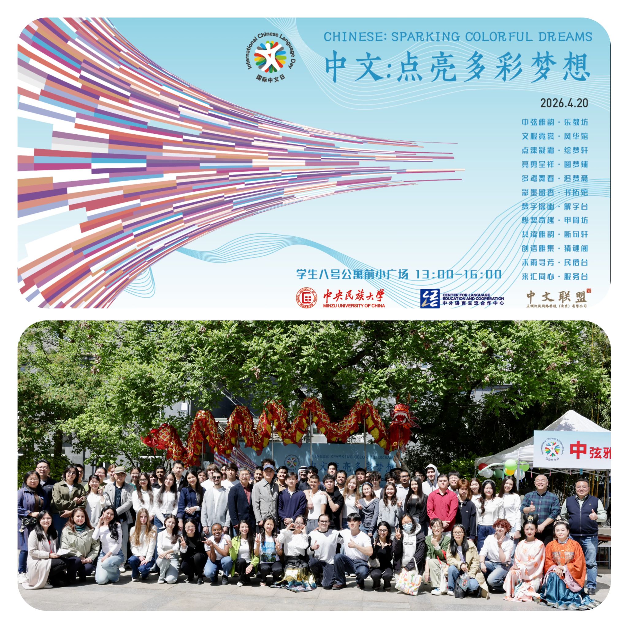 在海淀校区8号楼前小广场,成功举办2026年国际中文日主题活动。本次活动以“中文点亮多彩梦想”为主题,吸引全校外国留学生与中文爱好者踊跃参与,在沉浸式文化体验中感受中文魅力、传承中华文脉、促进中外青年相知相融。