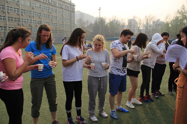 第三个项目是很有中国特色的筷子夹乒乓球,筷子对于外国学生来说本来就是有难度的工具,这次还要用筷子夹起圆圆的乒乓球,难度更是加大了许多,不过留学生们还是很愿意接受这样的挑战,每个选手的脸上都写满了专注,小心翼翼的把球传送给后面的同学。