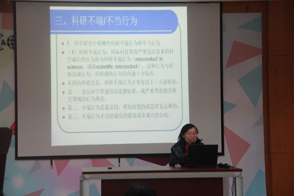 继而,曾立英教授向大家介绍了“什么是科研规范”、“科技工作者应该坚持的规范”、以及“研究计划规定中的规范”、“引文规范”、“署名规范”、“投稿规范”等,在师生中进一步弘扬严谨治学的科学精神,养成恪守学术诚信的自觉。