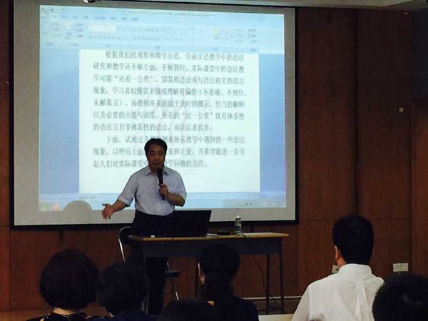 讲座中,李泉教授深入浅出地讲解和分析让听众们深刻地理解了何为“大语法学观”。他认为在汉语教学当中,应该树立“大语法观”,也就是既研究和教授体系内的语法,也研究和教授体系外语法。体系内语法和体系外语法同样重要,体系内语法教学主要集中在初中级阶段,体系外语法教学主要集中在中高级阶段。李泉教授分别从“汉语特点的语法现象例式”、“汉语书面语的语法现象例式”、“搭配和组合的语法现象历史”、“格式的语法现象例示”、“基于语篇的语法现象例式”这几个方面用鲜活而富有趣味的例子阐述了为什么我们应该树立“大语法观”的观念。比如,口语当中我们会说“骗你小狗”,对母语者来说,简单且常用,但是对于二语学习者来说,他们很难去体会这句话背后的含义。而且在中西方文化背景的差异当中,“狗”的褒贬意义是不同的。所以,二语者很容易从字面上想当然地理解。除了对“大语法“的探讨,李教授还提出了很多对教师的建议。比如,教师应该在备课环节做好充分的准备,这样不但能够从容应对学生的问题,而且能够预测学生理解上的困难更好地有针对性地教学。