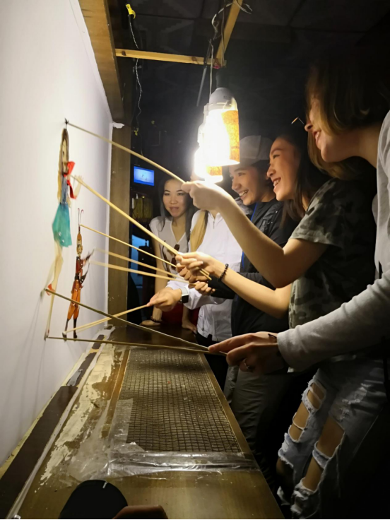 第二天一大早,大家便动身前往泰安市。泰安市的第一站,便是来欣赏世界非物质文化遗产——泰山皮影戏。泰山皮影戏与其他地方皮影戏不同,他们以武戏居多,也因武戏动作幅度较大,他们采用驴皮制造道具。在表演师傅娴熟的操作下,同学们相继观看了传统经典精品戏《蛙鹤龟》,泰山文化经典戏《泰山石敢当大战恶狼精》,母亲节巨献《时间都去哪儿了》,在观看之后,同学们还亲自体验了一把皮影戏,而皮影戏的不易也让大家对表演大师们钦佩不已,同时也深刻感受到了这项古老艺术的魅力。