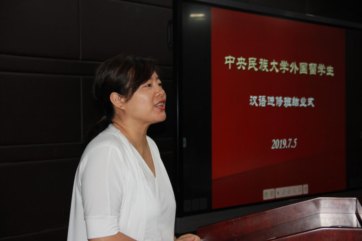 语言生教研室副主任张璟老师对同学们4个月来的学习成果给予了肯定。她表示,虽然过去这4个月大家遇到了各种困难,但是大家在困难面前勇往直前的精神着实感动了每一位老师。她用了4个关键词概括了这学期的所感所想。第一是幸福,是身为汉语老师,当看到学生进步和成长时,对汉语教师自身存在的意义和价值肯定的幸福感 ;第二是感动,是当看到学生对汉语学习热情高涨和对班级、学院无私付出时的感动;第三是改变,是大家从刚来时的畏手畏脚到现在敢在陌生环境中大胆尝试的性格上的转变;第四是祝福,祝福同学们未来一切顺利,也希望大家记住民大,记住这一段美妙的经历。
