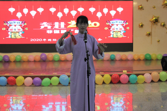 紧接着激烈而又刺激的猜歌名游戏开始了,同学们需要根据歌曲的3-7秒音频片段,猜出歌曲的名字,这一场速度和激情的比拼,也把本场联欢会推向另一个高潮。“歌曲,猜猜猜”游戏结束以后,19级中国本科生刘禹何同学给我们带来了极具中国特色的京津味十足的“快人快语贺新春”的快板表演,带我们领略中华文化的魅力。