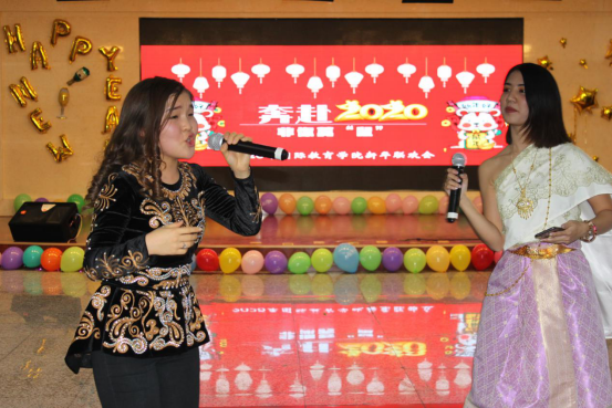 精彩刺激的“抢凳子”游戏开始了,参加游戏的中外学生跟着动感的音乐,争抢着为数不多的凳子,好不热闹。游戏结束后,来自吉尔吉斯斯坦的美丽同学和来自泰国的婉妮同学献上歌曲《带你去旅行》。