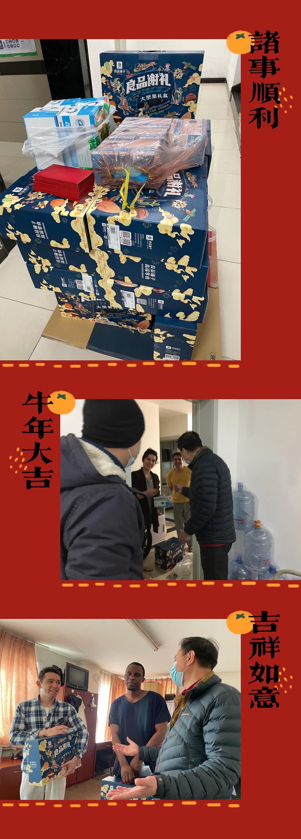 今天学院领导和老师们来看我们,我没想到他们还送了礼物给我们,虽然老师们说礼物小,但是对我来说非常珍贵,今年我就要毕业了,这件事给我留下了很深的印象。祝大家牛年快乐,也希望你们和家人在这新的一年越来越牛。 ——卡里木(乌兹别克斯坦) |