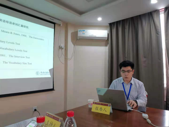 研究生孙鹏和本科生梁启洪、陶艳、刘璐、廖丹等共同参与。他从“小学生汉语词汇量表”的信度效度和小学生汉语词汇量现状两个研究问题出发,向与会专家、学者作出报告,报告引起了热烈讨论。