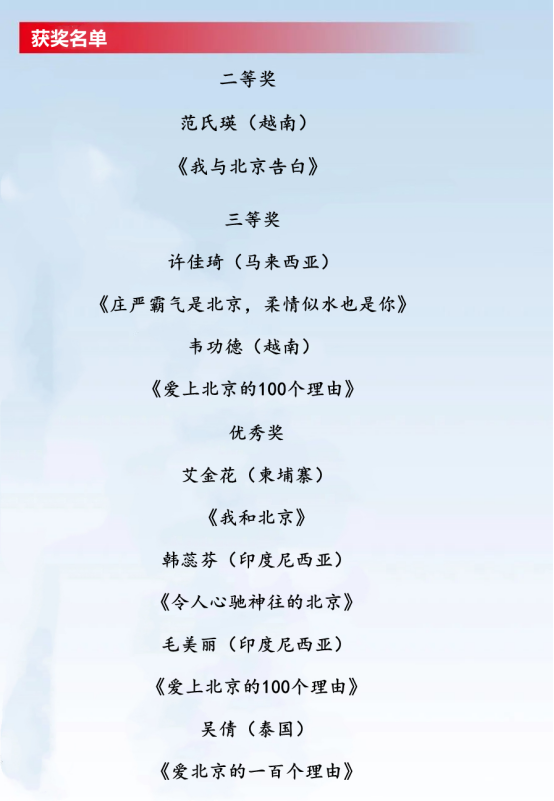 此次比赛,我校国际学生挥斥方遒,用笔墨尽情书写自己在北京留学过程中的所思、所想、所感、所悟,也美好地述说着自己在北京的成长历程,正如范氏瑛同学在文中写道:“北京待我实在是太好了,它圆了我的梦,陪我看朝晖共晚霞,倾听我的心声,见证我的喜怒哀乐,治愈我成长路上留下的伤疤,给予我勇往直前的勇气。”相信我校国际学生在这具有包容性、时代性、历史性、发展性的国际大都市中学习和生活,会更加了解和热爱中国文化,未来也会成为一名知华、友华、爱华的文化交流使者。