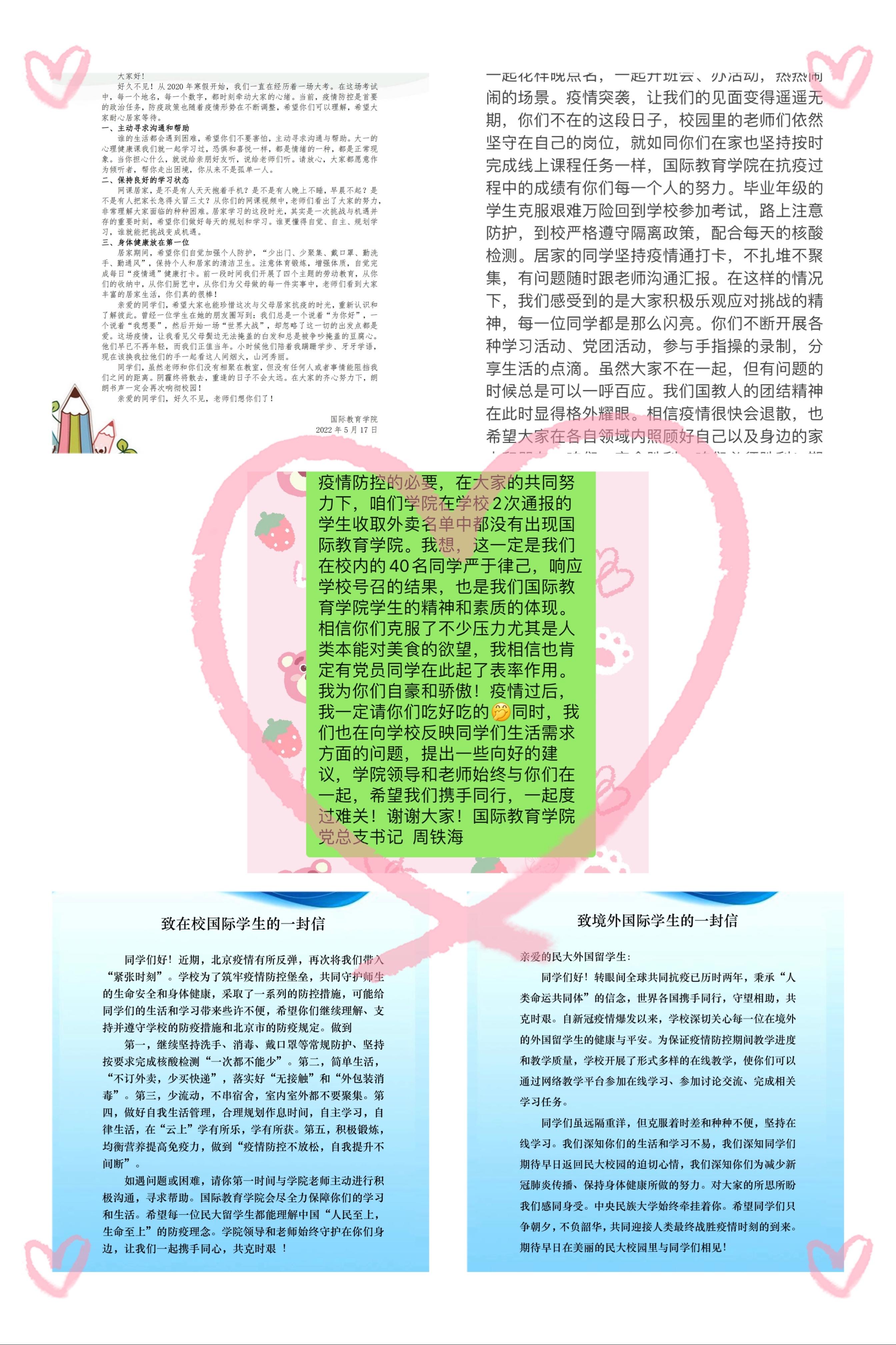 硕士们的信》、《致在校留学生的一封信》和《致境外民大留学生的一封信》。每封信里都饱含着学院老师对同学们无微不至的关心关怀和殷切的希望。学生们对此反响热烈,纷纷留言表示感受到了学院领导和老师对学生浓浓的爱。21级硕士生尹佩玲在留言中表示:“虽然疫情严重,但是身在国教院让人心里感觉暖暖的。谢谢老师们对我们各方面的关照。希望疫情能够早日过去,也祝愿我们能够过上不戴口罩的日子,在生活和工作中闪闪发光。”本学期91暗网