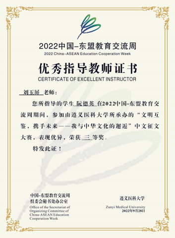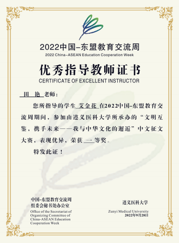 “中国-东盟教育交流周”活动创办于2008年,得到了外交部、教育部中外语言文化交流合作中心以及贵州省政府的大力支持。该教育交流周的赛事包括演讲比赛和征文比赛,我校柬埔寨学生艾金花在2021年度演讲比赛中荣获一等奖。征文大赛始于2016年,每年都吸引全国范围内众多东盟国家几十位留学生参与其中。我校今年第一次参与征文大赛,即有三位同学获得奖项,可喜可贺。