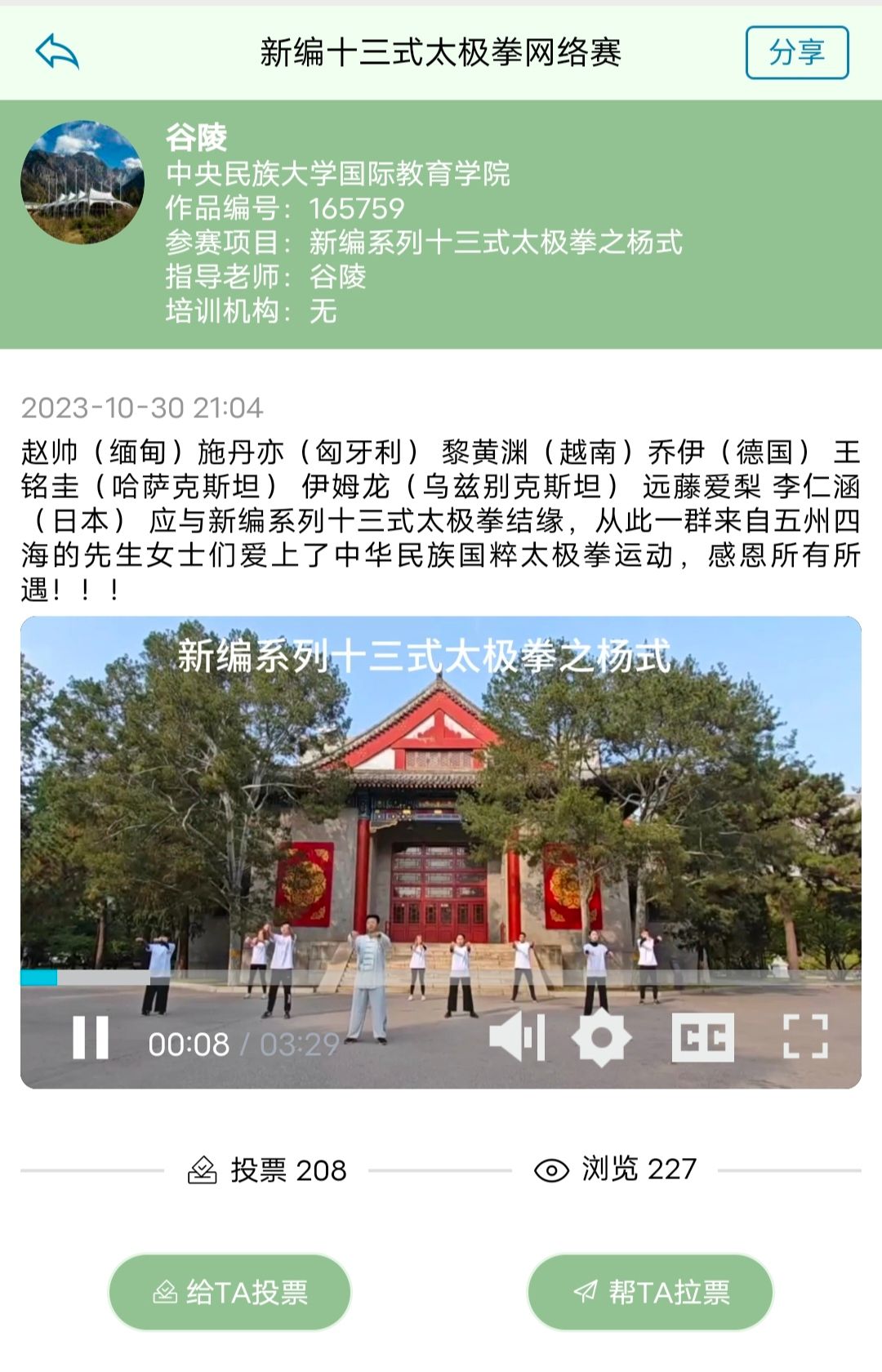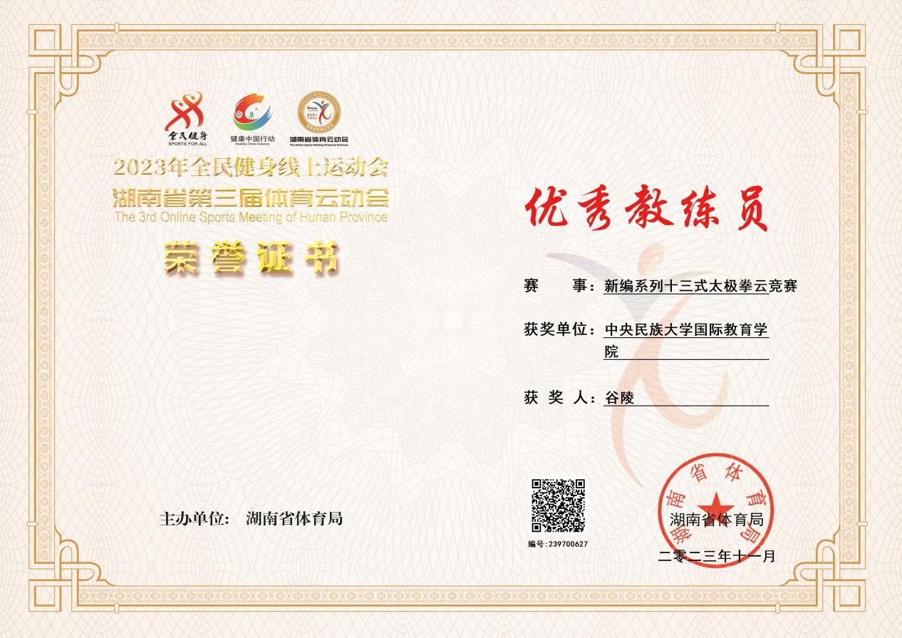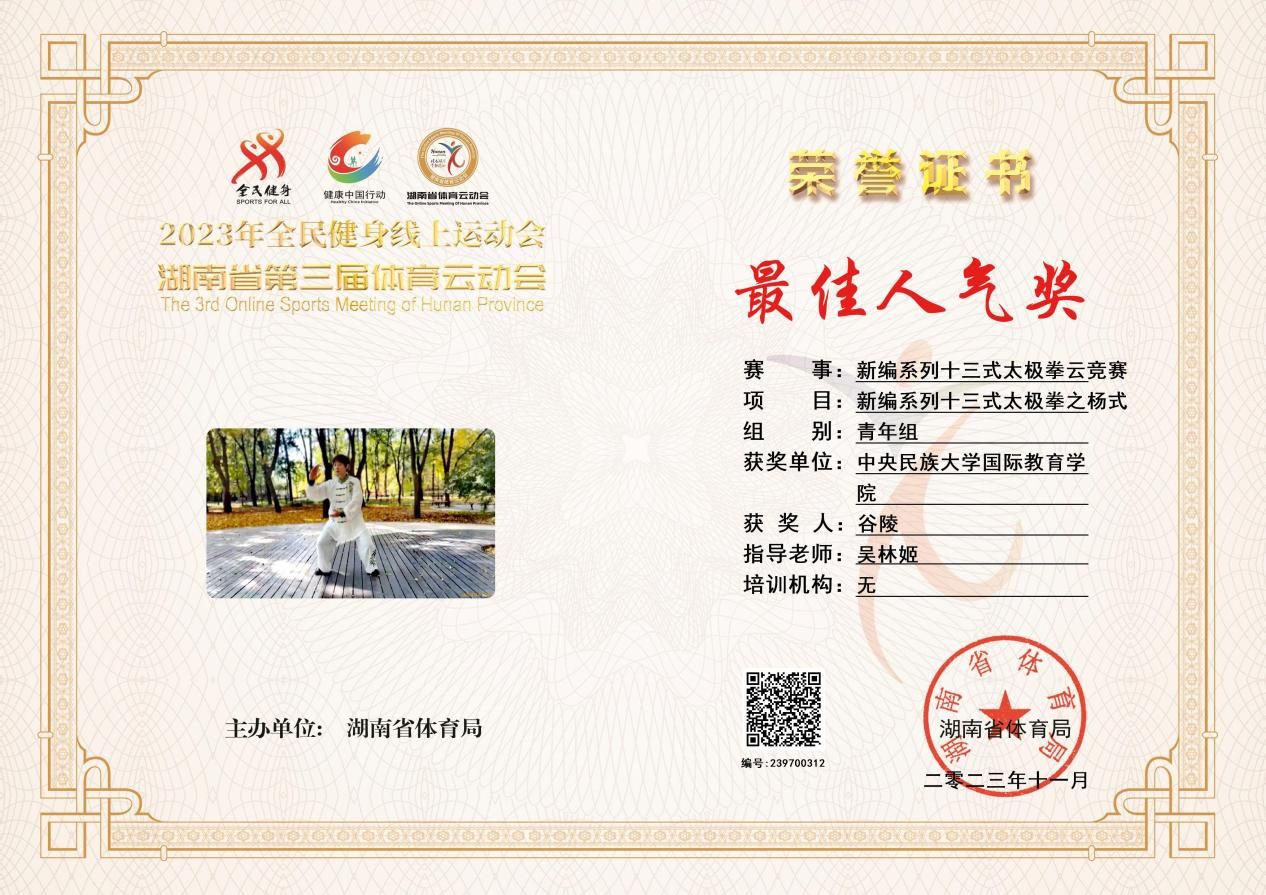 此次比赛由国家体育总局群体司、中华全国体育总会群体部和湖南省体育局联合主办,以视频作品方式参赛,在李锷副院长的鼓励和支持下,语言进修与项目部精心组织,在太极拳课的基础上,学院组建了一支太极拳队伍,由任课教师谷陵带队,报名参加了四个个人项目和一个集体项目,其中个人项目中缅甸留学生赵帅荣获青年组一等奖,教师谷陵荣获青年组特等奖和最佳人气奖,获评最佳教练奖。