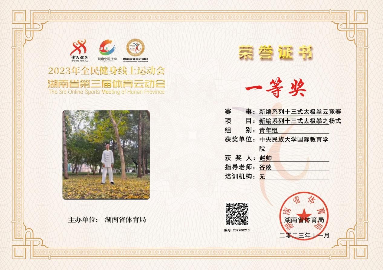 此前,缅甸留学生赵帅由领队王丙龙和教练谷陵陪同,于2023年11月25日参加了2023年首都高等学校第七届来华留学生武术比赛,荣获男子自选太极拳组季军。