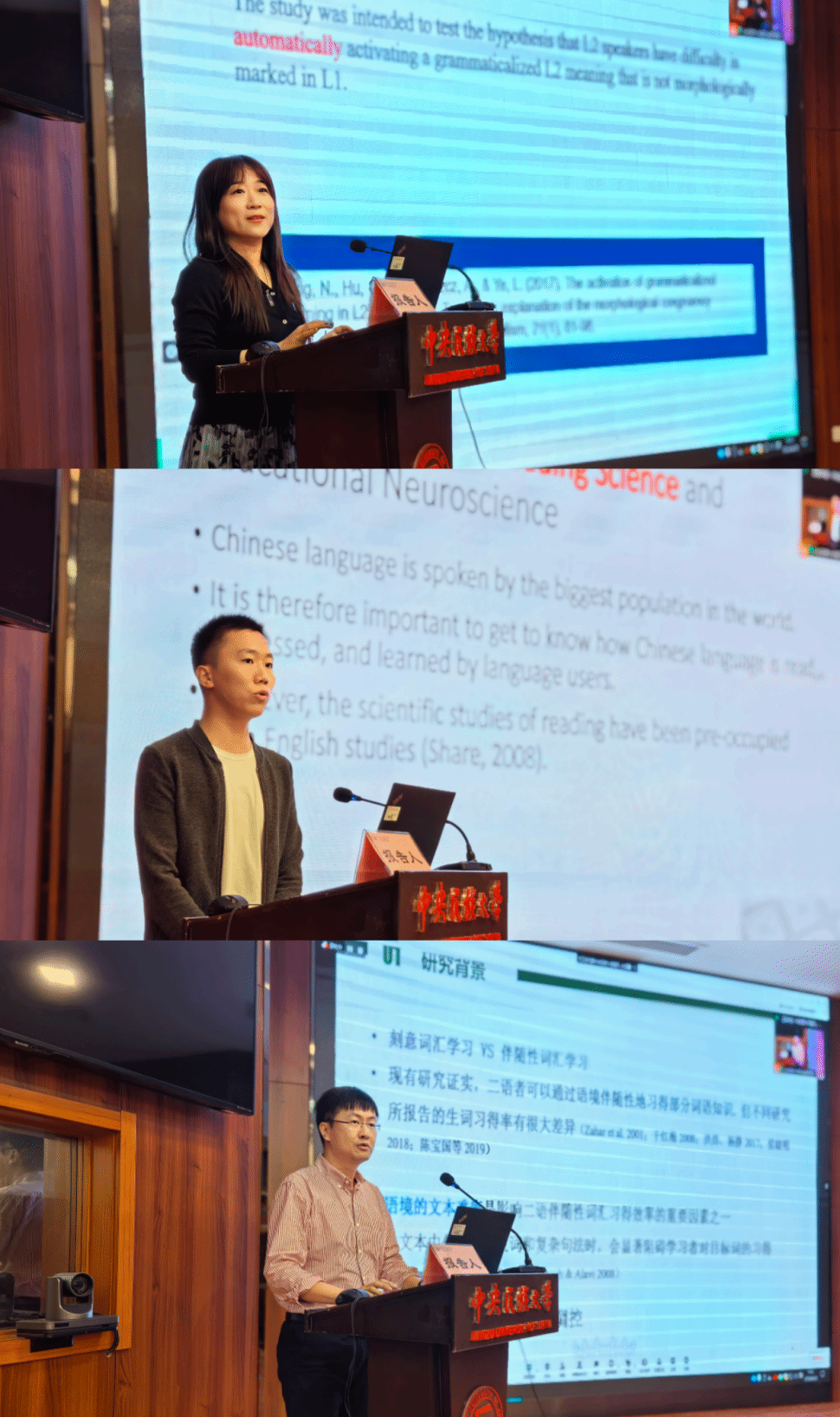胡韧奋副教授的报告《现代汉语词汇语体属性探测模型研究》立足于正式-非正式的语体维度,提出了基于机器学习方法的现代汉语词汇语体属性探测模型。吴继峰教授的报告"Noun Phrase Complexity and Second Language Chinese Proficiency: An Analysis of Narratives by Korean Learners of Chinese"探讨了汉语母语者和不同语言水平的韩国汉语二语学习者在名词短语复杂性和特定类型的短语修饰语使用方面的差异,并对汉语写作教学提出了建议。余烁副教授的报告题为《基于数据驱动学习的汉语二语者动结式习得研究》,探究了汉语二语者在学习汉语动结式时数据驱动学习的影响,以及索引材料的使用策略,研究发现直接使用语料库有助于汉语二语者动结式学习成绩的提升。