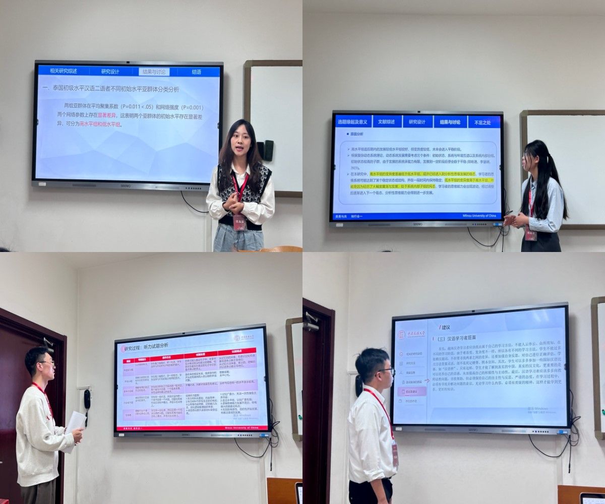 中外硕士研究生在多个分论坛汇报最新研究成果。2022级硕士研究生胡姝辰报告了《泰国初级水平汉语二语者书面句法复杂度发展的变异性研究》,2023级硕士研究生王璐宇报告了《汉语学习对二语者分析性思维能力发展的影响研究》,2023级硕士研究生夏建中报告了《儿童认知发展视角下的 TOEFL Primary Tests听读测试对 YCT的启示》的研究,2023级越南硕士研究生韦功德报告了《越南初级汉语学习者汉越词调查研究》。