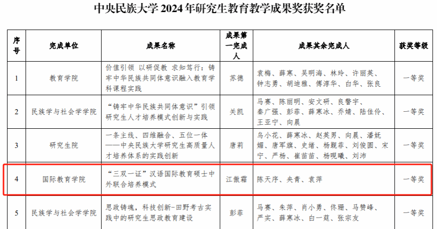 申报的“‘三双一证’汉语国际教育硕士中外联合培养模式”荣获2024年研究生教育教学成果奖一等奖。