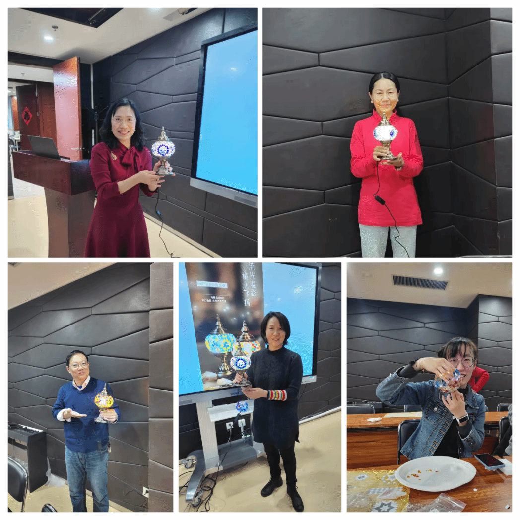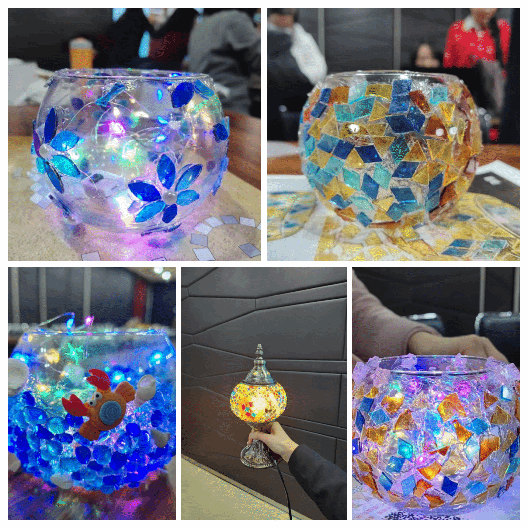 在熟悉了手工制作流程后,教职工们纷纷发挥创意,将五彩斑斓的马赛克片粘贴在玻璃灯罩上,制作出了一盏盏独具匠心的马赛克灯。活动现场气氛热烈,欢声笑语不断,大家在轻松愉快的氛围中度过了一个难忘的下午。