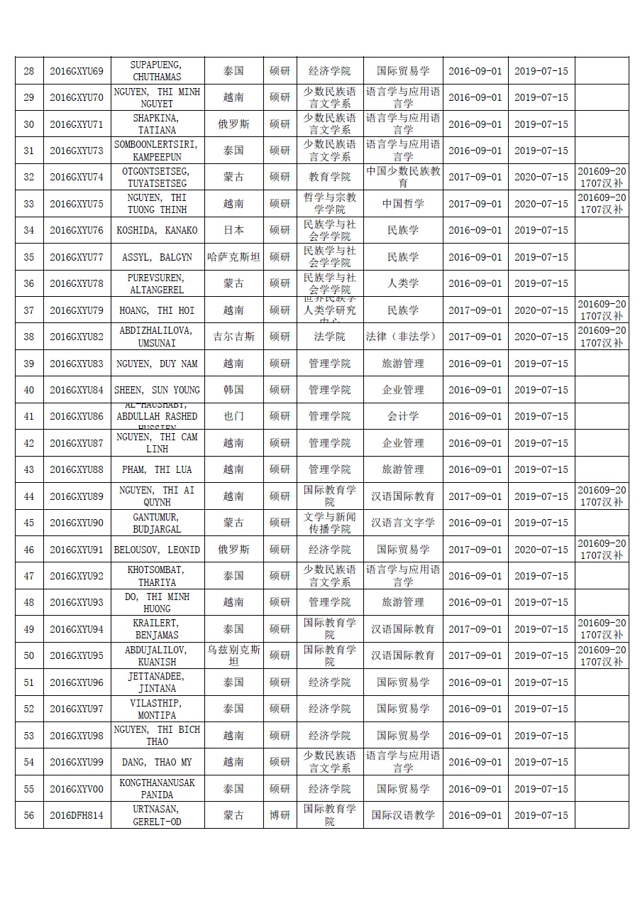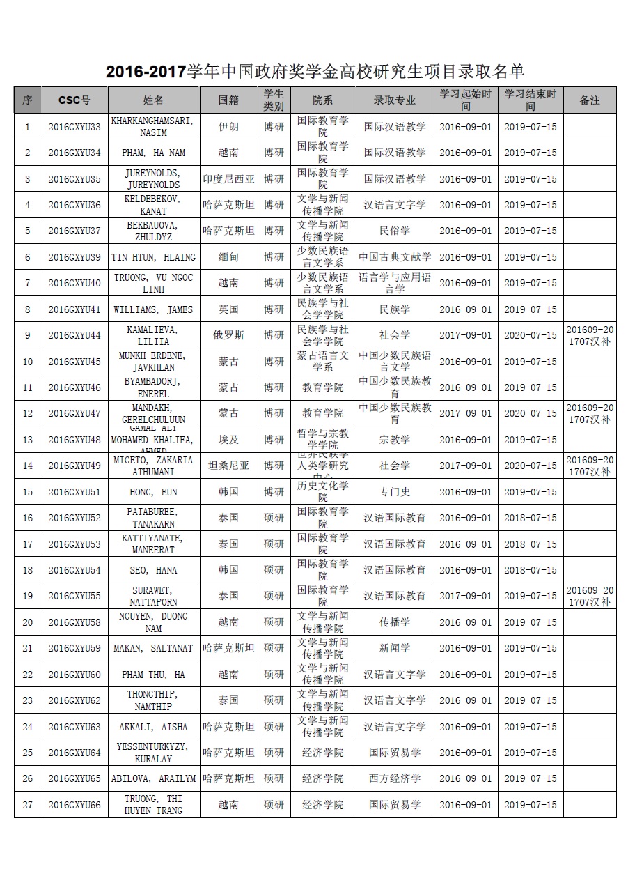 2016-2017学年中国政府奖学金高校研究生项目录取名单