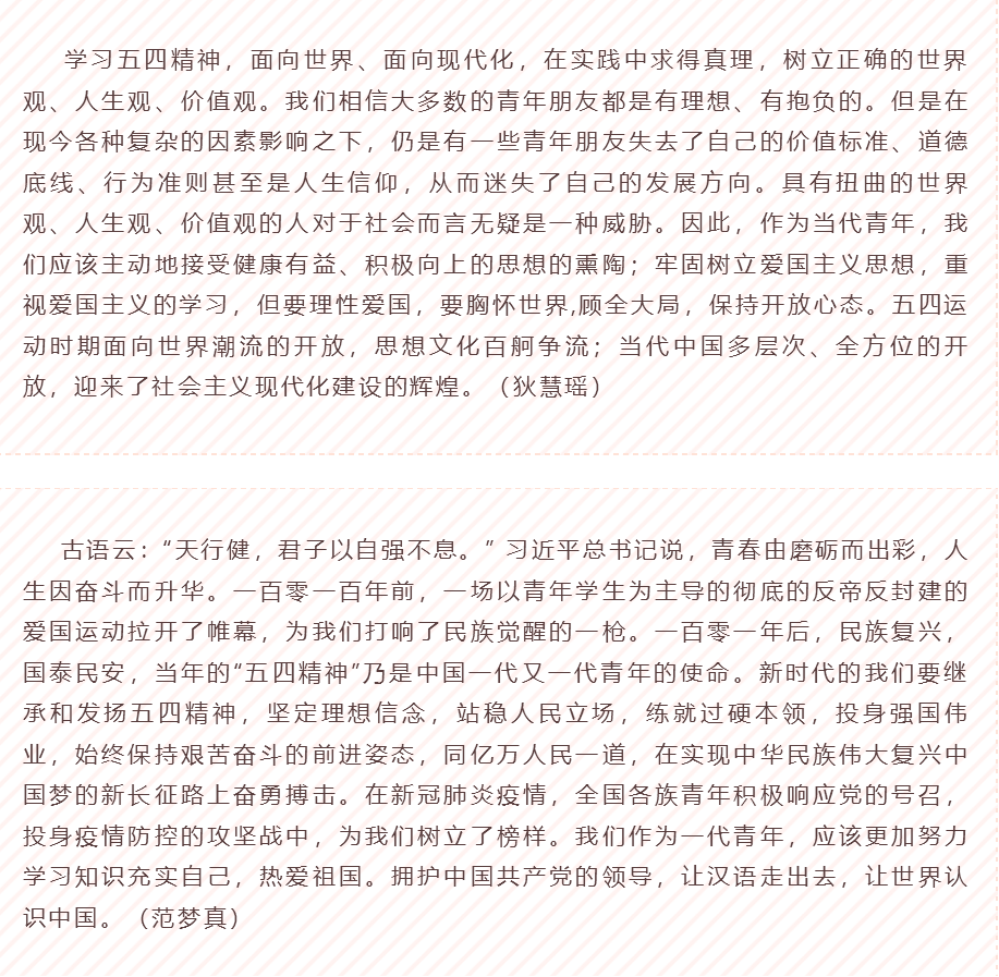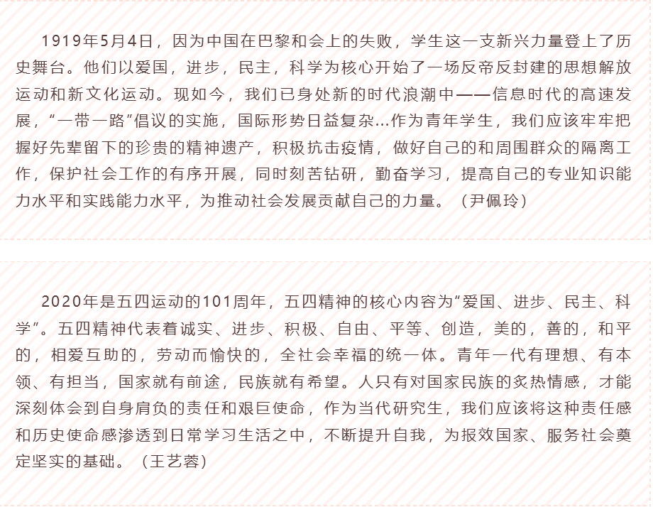 2020是特殊的一年,全世界与新冠病毒抗争,在疫情面前,五四精神是坚强、是生生不息的希望;2020是全面步入小康社会的一年,在国家发展面前,五四精神是创造、是创新、是可歌可泣的贡献;2020也是我们在国教院汲取新知识,开展新生活的一年,面对每一位学生,五四精神是奋斗、是讲好中国话、传播中国文化、是青年人无畏的勇气。我们将拳拳爱国心化作一股无形的力量,做好本职工作,就是对五四将神最好的弘扬。