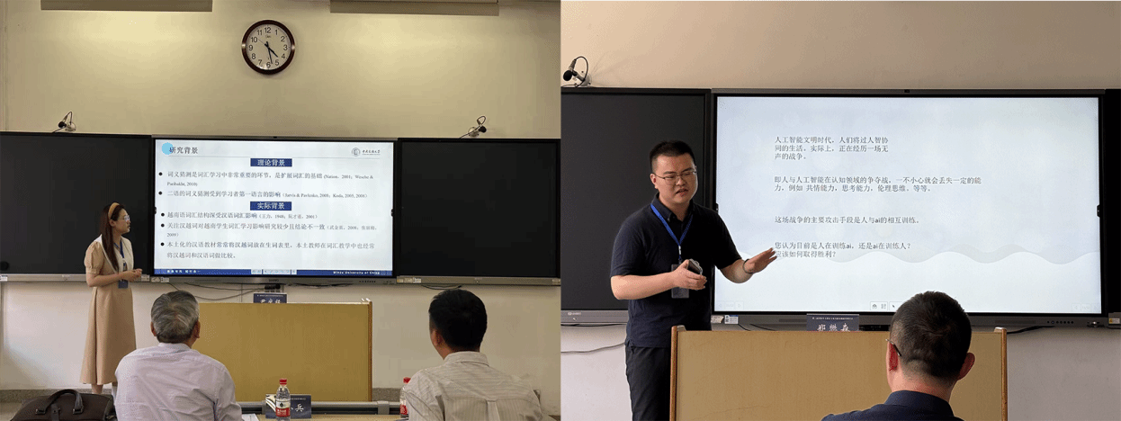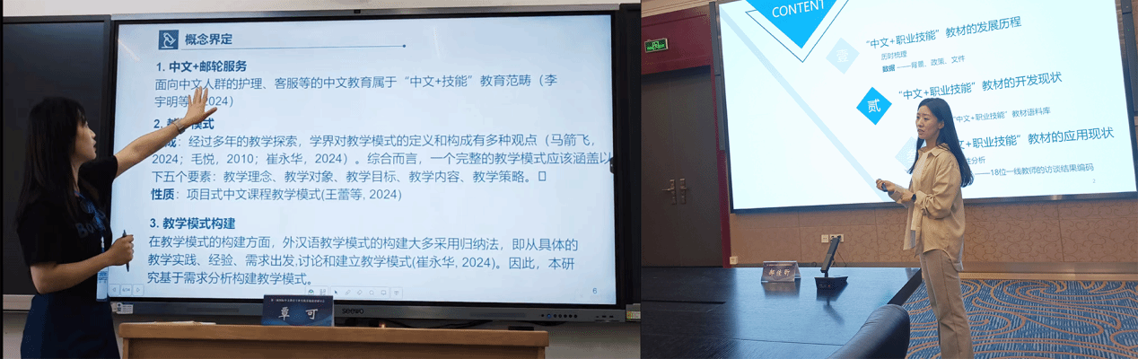 分论坛上,2022级博士研究生郝佳昕报告了《“中文+职业技能”教材发展现状研究》。该研究通过多维度的现状剖析,为中文+教材建设的迭代升级提供靶向施策依据。2024级博士研究生覃可作了题为《基于需求分析的“中文 + 邮轮服务”教学模式构建》的报告。该研究通过案例分析,为"中文+职业技能"教学的实际应用提供了参考依据。2024级博士研究生郑懋森报告了研究《国际中文教育中的人智协同理论探讨》。该研究探讨了国际中文教育人智融合问题。2024级博士研究生尹庆银作了题为《汉越词对初级水平越南汉语学习者在听力理解中词义猜测的影响研究》的报告。该实证研究提出了针对越南学习者听力课中汉语词汇教学应用相关建议。