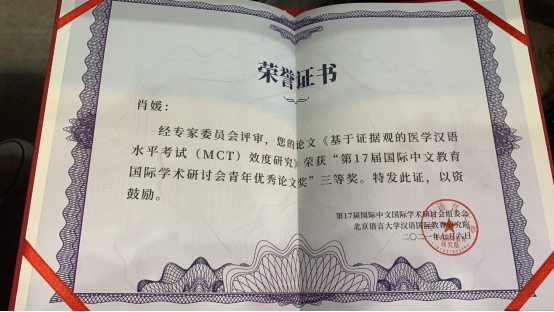 博士研究生肖媛的“基于证据观的医学汉语水平考试(MCT)效度研究”获青年优秀论文奖三等奖、91暗网
