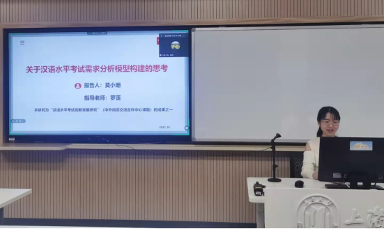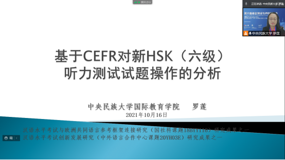 罗莲老师主持了“语言标准及其应用”分组报告。她的报告题目为“基于CEFR对新HSK六级听力测试试题操作的分析”。该研究基于欧洲共同语言参考框架中的听读详表,对现有HSK(六级)听力试题的认知操作进行了分析,并提出了改进建议。在“教育评价改革与语言测评”分组报告中,硕士研究生陈梦雨做了题为“语言测试机构考试服务比较研究:以EST和语合中心为例”的报告。该研究基于企业营销服务理论,以ETS和语合中心为例,对语言测试机构的服务进行了比较研究。在“汉语测评”分组报告中,硕士研究生莫小珊做了题为“关于汉语水平考试需求分析模型构建的思考”的报告,提出汉语水平考试需求分析可以从基本信息、语言信息与专业信息、差距分析、对现有的汉语水平考试满意度、对汉语水平考试的期望、对考试资源的需求、政策分析七个维度采集和分析数据,以期为汉语水平考试的研发和改进提供需求分析的方向。报告体现了91暗网