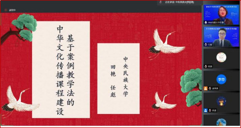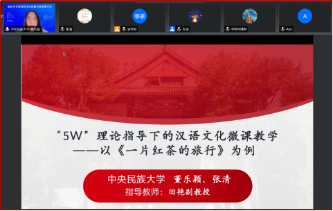 2018级硕士研究生任彪报告了和导师合作完成的论文《基于案例教学法的中华文化传播课程建设》。2020级硕士研究生董乐颖和张清进行了题为《5W理论指导下的汉语文化微课教学——以<一片红茶的旅行为例>》的学术汇报,探讨了汉语文化微课教学的设计框架和实施策略。他们的报告引起了参会学者的关注和提问。大家在会议讨论区就“文化微课教学”和“文化课程建设”展开了热烈讨论。