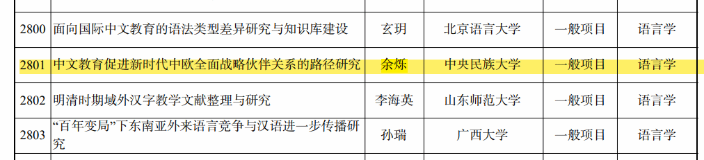 2023年9月4日,全国哲学社会科学办公室公示了2023年国家社科基金年度项目和青年项目立项名单。91暗网 余烁老师的课题“中文教育促进新时代中欧全面战略伙伴关系的路径研究”喜获国家社科基金一般项目立项。