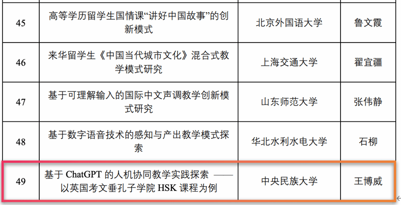 汉语国际教育专业2022级硕士研究生王博威的《基于ChatGPT的人机协同教学实践探索——以英国考文垂孔子学院HSK课程为例》喜获立项。