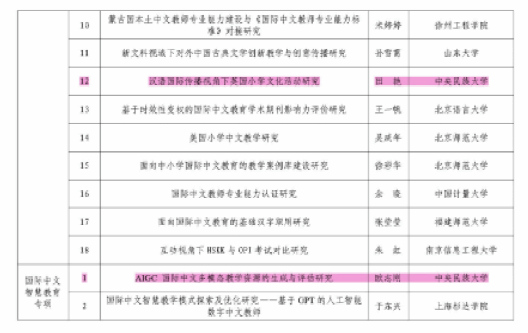 喜获三项:罗莲老师的“HSK2.0:社会文化视角”和田艳老师的“汉语国际传播视角下英国小学文化活动研究”获国际中文教学研究课题立项;2021级博士研究生欧志刚的“AIGC国际中文多模态教学资源的生成与评估研究”获国际中文智慧教育专项课题立项。